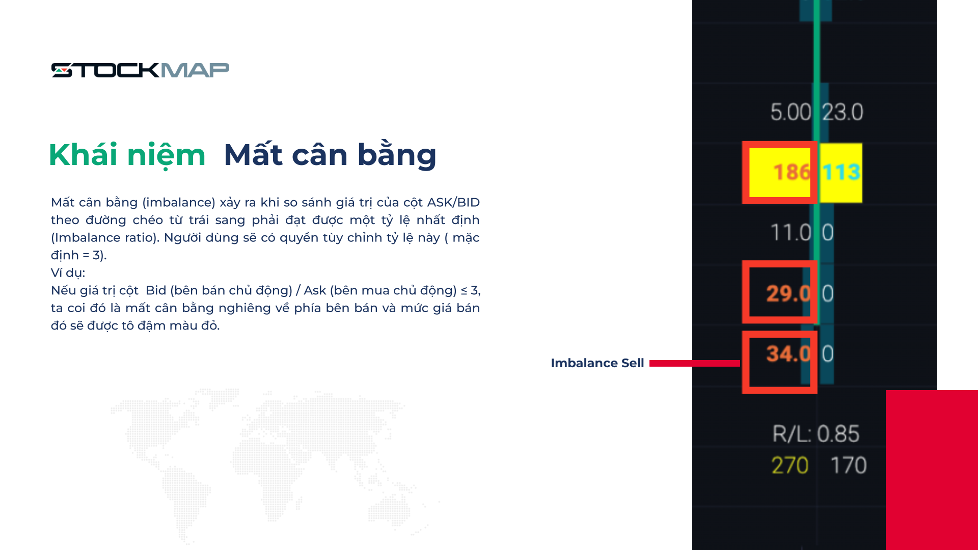 Nếu giá trị cột Bid (bên bán chủ động) / Ask (bên mua chủ động) ≤ 3, ta coi đó là mất cân bằng nghiêng về phía bên bán và mức giá bán đó sẽ được tô đậm màu đỏ.