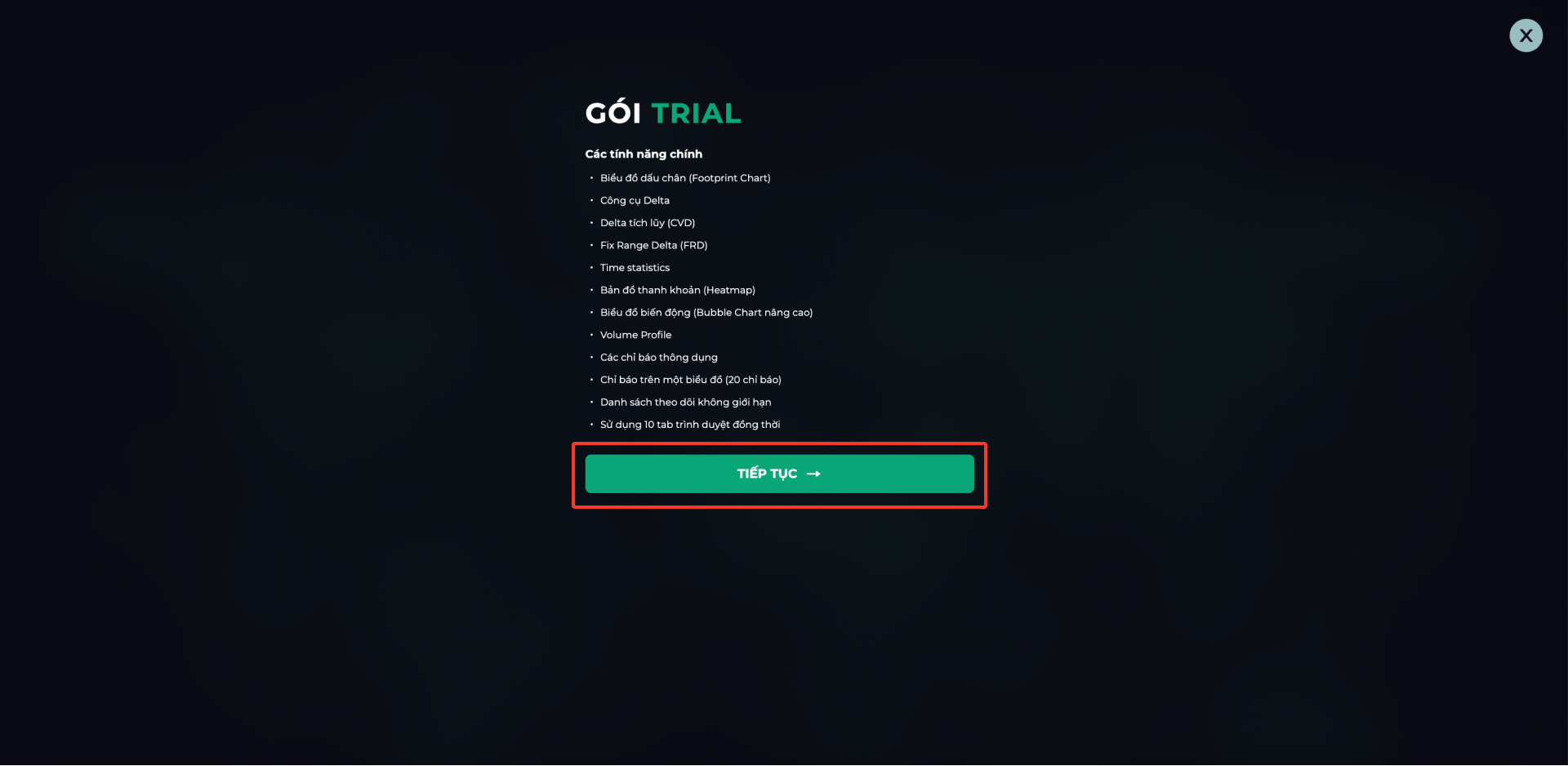 TIếp đó phần thông tin các tính năng của gói FREE TRIAL sẽ hiển thị , bạn vui lòng nhấn vào nút <mark style="color:green;">**TIẾP TỤC**</mark>.